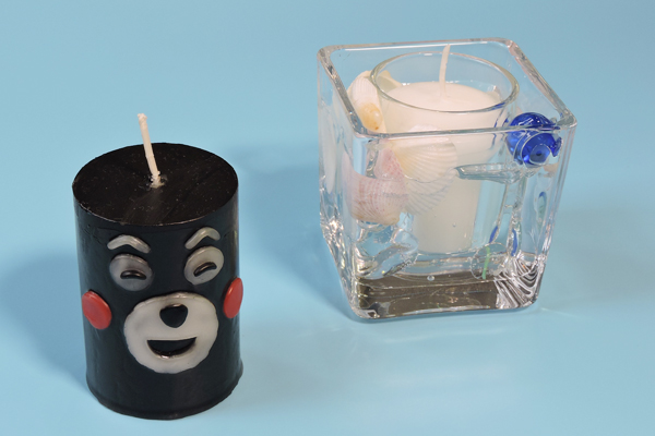 キャンドルは、パラフィンワックスを基にアロマをブレンド、日本の四季に調和した作品です。水に浮かぶ花びらキャンドルやくまモンキャンドルづくりが体験できます。