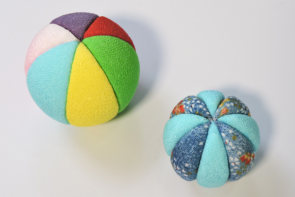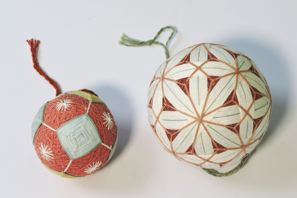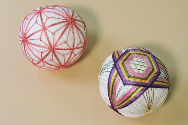 肥後まりは、モミ殻を芯に、草木染めの木綿糸を幾重にも巻き付けて、ツバキやアサガオなど13種の文様を手かがりします。1968年ころ、民藝家の外村吉之介が考案・大成させた素朴な風合いの伝統的工芸品です。