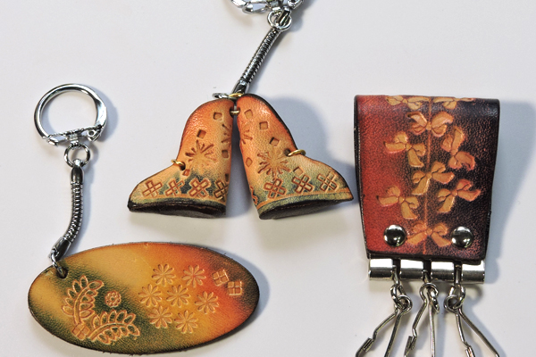 革工芸は、鞣した牛や山羊、豚の皮を使用し、革の表面に写し取った図案に沿ってカービング(線掘りなどで文様を入れる)した後に染色し、糸や皮紐で仕立てる根気のいる作業が続きます。カード入れやキーホルダーづくりなどが体験できます。