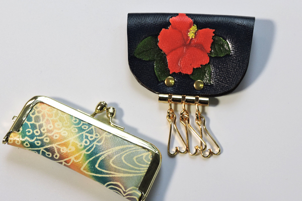 肥後革ローケツ染は、鞣した牛革に草花の図案を描き、ロウを使って色染めします。肥後六花を中心にした「明るさ、鮮やかさ」が特徴で、靴ベラや小銭入れなどが体験できます。