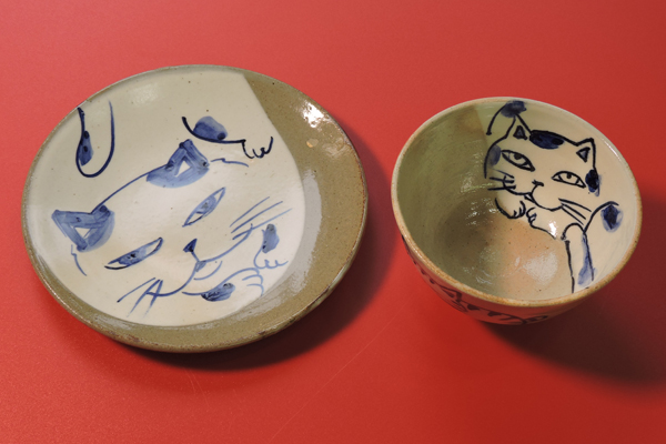 千金甲窯は、金峰山麓の「古墳」から名が付いたもので、鉄分の多い赤土に天草陶石を使って化粧掛けをします。そして、粉引搔き落し技法で「ネコたちの表情」を下絵なしで描きます。お皿、お茶碗、カップなどの製作体験ができます。
